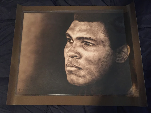 I also chose this gorgeous sepia toned piece also constructed by Villarreal, entitled "Thoughtful", of boxing legend Muhammad Ali. Ali has always been one of my all time favorite sports figures, and I browsed their Ali art collection page to add something of his to my collection. I loved most of them, but ultimately sided with this emotional work. I think I made a good choice!